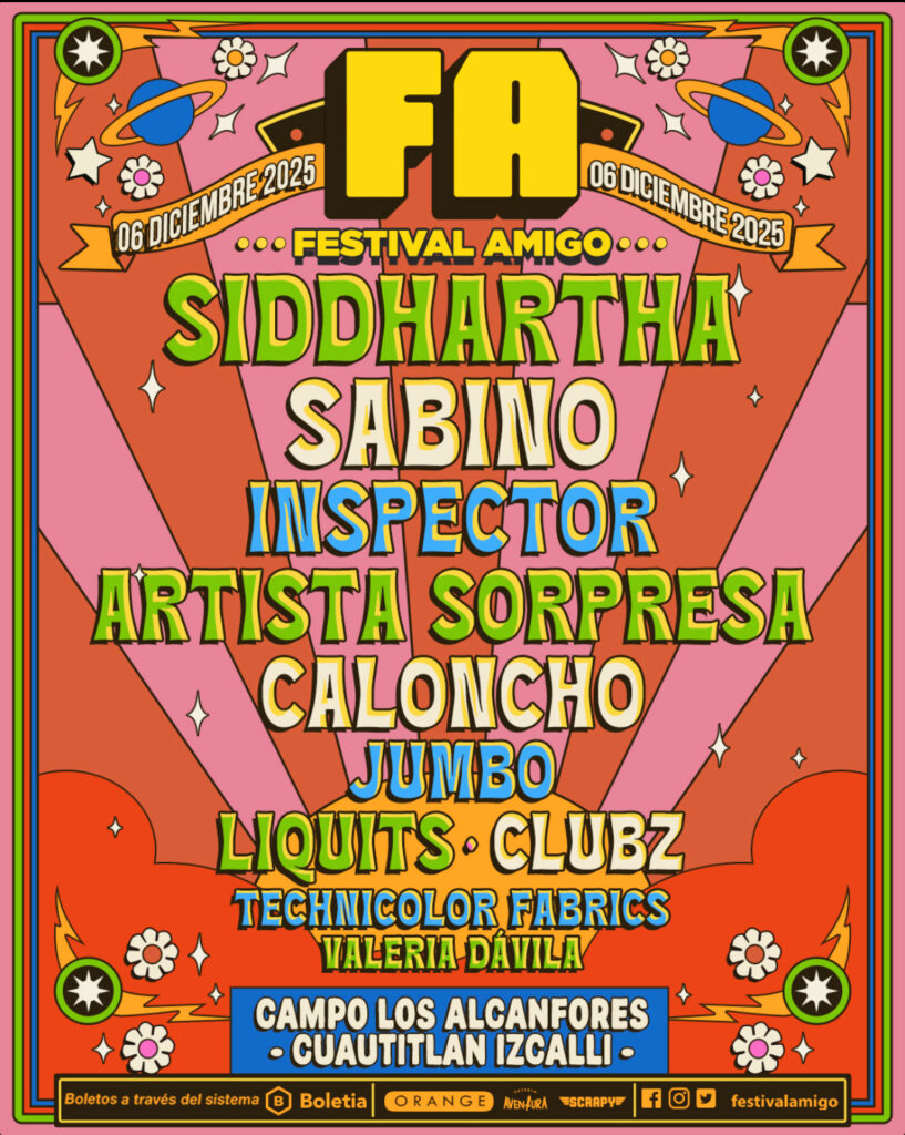 La alineación también incluye a Caloncho, Jumbo, Liquits, Clubz, Technicolor Fabrics y Valeria Dávila, configurando una mezcla diversa que abarca desde el rock alternativo hasta el pop contemporáneo y sonidos experimentales. En conjunto, el Festival Amigo apuesta por una experiencia musical amplia, dirigida tanto a quienes buscan propuestas nostálgicas como a quienes desean descubrir nuevas corrientes.