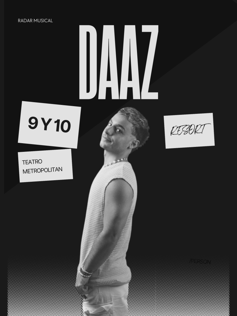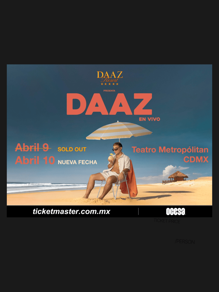 El artista se presentará los próximos 9 y 10 de abril de 2026 en el Teatro Metropólitan, uno de los recintos más emblemáticos del país. Ambos conciertos están programados para iniciar a las 21:00 horas, y forman parte de su gira conceptual Daaz Resort Tour, con la que busca llevar una vibra fresca, veraniega y llena de energía al escenario.